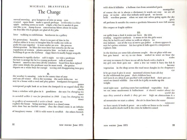 The sparse language, and short lines are insisting: ‘these lines’ are not real either, this is not confession, it’s poetry’. Dobrez, however, comes up with this interpretation: ‘It is as if enveloping post modern technocratic society were conspiring to rob its members of the real, so that relief might come through artificial channels, the mass media, or books, or drugs,’ what Dobrez misses is that poetry itself could be for Dransfield yet another ‘artificial channel’. He didn’t write in the ‘confessional mode’ that was so popular at the time. (In 1967 Sidney Noland’s portrait of Robert Lowell adorned the cover of TIME magazine along with a story about ‘confessional poetry’.) It’s always misleading to look too closely at the poetry for clues about the life. Dransfield can be flexible and witty, he can swing from symbolist to dada in one line, or from lyric to parody in a poem. He can easily mix the whimsical realism of Jacques Prevert with the sarcastic rhetoric of Gregory Corso.