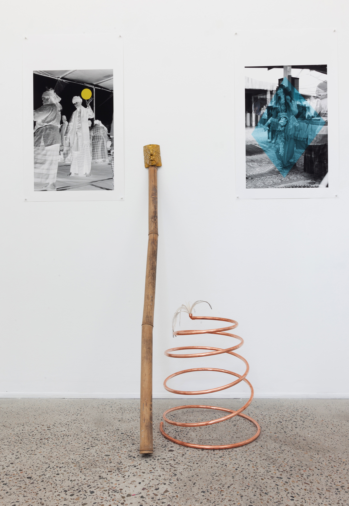 Coincidental traits in biology are expressed through the installation art elements present in The Mobility of Happiness. In this exhibition, there is a ladder made of copper leading nowhere (or to an ephemeral state of ascendancy), easily interpreted as a straightened DNA double helix, its structure reformed, less biological, a coincidental act, which makes room for inherited spirituality in our gene code. The spatial area of the exhibition space is treated like a minecraft style of open world, a world of stability and chaos. With a firmly erect plinth displaying traditional offerings to the spirits from Burmese mythology, conflicting against a clutter of objects such as a fallen copper stand, possibly to signify the falling pillar of history and ultimately a failing inheritance, a temporary collapse of rationality, leaving enough time for a happy accidental happening, a mobility of happiness.