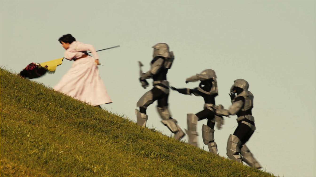 An internal battle is fought against futuristic gamer Halo-like soldiers wearing cardboard armour. The protagonist doesn’t confront them head-on, possibly in the same way that it’s difficult to internalise any new idea. She chooses to flee or outrun them, fighting them off in flight, wrestling with the dilemma: what about violent revolution? And what will this mean for me, my family, my society?