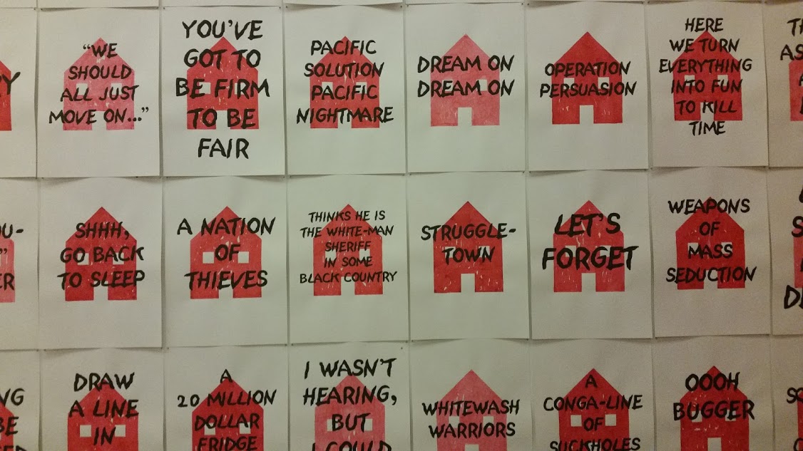 I’m sitting on a couch in a large hall on level 3 of the MCA in the Aleks Danko exhibition My Fellow Aus-tra-aliens. On the two long walls of the hall there are 220 sheets of paper. Each sheet has a printed image of a red house, a single opening on the bottom level representing a door and two white space window on a second level. A peaked roof points to the next sheet immediately above it. On each sheet there is a short text, many of which are familiar to anyone who has followed Australian politics over the last decade or so. Thiswork, ‘Songs of Australia Volume 16 – SHHH, Go Back To Sleep’, was created in 2004 so many of the quotes are by or about the Howard government, but it depressing just how many of them still resonate to us today: