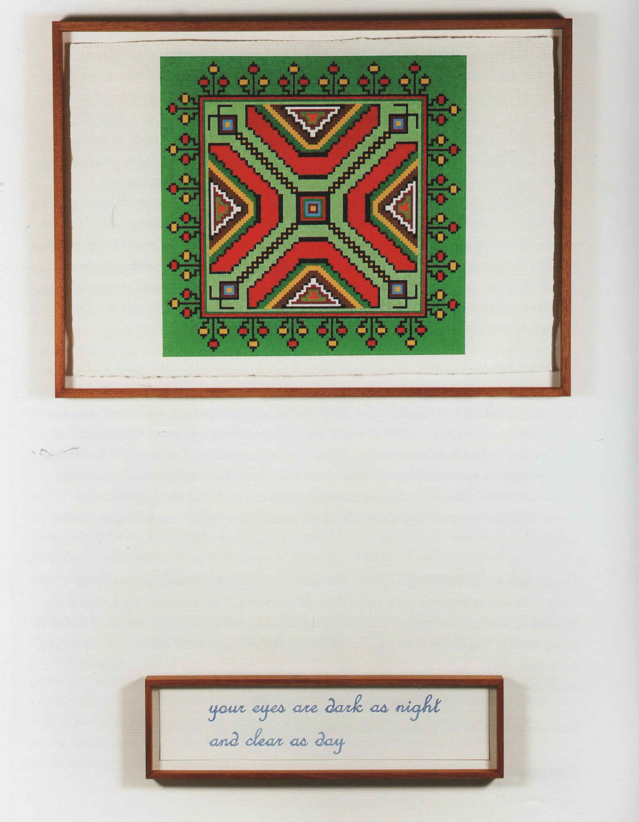 One of the most moving parts of the exhibition relates to images of his mother’s embroidery – much of it done while she was waiting in the migrant hostels. Once again there is a sense of alienness about these images – they are different, Un-Australian images from a distant culture. Danko took these images as central to his work Some Cultural Mediations – working the designs his mother and her friends embroidered onto cushion covers while in the migrant hostel, he translated the designs, rendering them on paper. A motif emerged in the work – that of the centre, the core – a powerful image for Danko which, one senses, has provided a basis for much of his work.