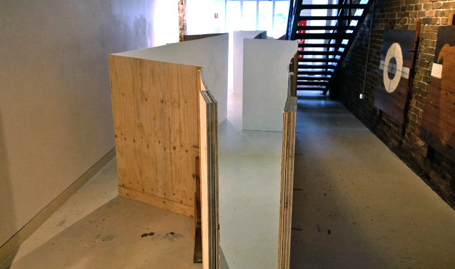 Inside-Out Sculpture² is a work that engages with sculpture and the constructed environment by merging both in the space in between. The sculpture is a long structure made of two walls in close proximity, 10 metres in length, 2.7 metres at its widest and 1.8 metres high – the building’s dimensions are considered in determining its size, shape, location and spatiality. It consists of a sculpture with external and internal form with narrow openings at both ends, which prevent entry into the clean white space within that replicates the finish of the all-white gallery. Audience movement is constricted in the tight space, as they are only allowed to walk around the work in narrow aisles and peer over walls high enough to stop entry but low enough to look over. The external appearance is left unfinished and provides visual and tactile contrast to the highly finished white interior. The long narrow configuration of the building as well as the work situated within prevents observers from seeing the entire work at a glance from one vantage point and multiple views from different areas are needed to take-in the work.