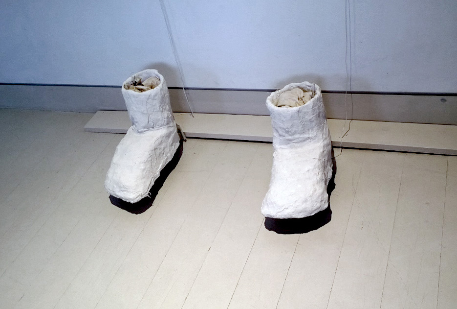 By engaging with the all-white gallery space, Rose Ann McGreevy believes she did not look at spatiality in a literal sense, as a diagram or visual metaphor that explores and confronts rupture and straddles culture but as a personal codex that offers formalised dialogue.¹ ‘Site’ and ‘art’ are queried on whether one or the other is more important and did they interact, inform or interfere with the work. Two new sculptural works are included in the survey of McGreevy’s work and I concentrate mainly on these as they form the core of the exhibition. The first is Inside-Out Sculpture, a long structure consisting of two walls in close proximity and the second is The man who rolled a stone up a hill, a pair of motorised boots slightly smaller than life size. In creating Inside-Out Sculpture, a mediated constructed installation made in the absence of the artist, issues of collaboration and authorship are highlighted.