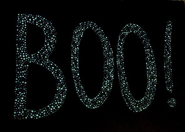 Perhaps Megan Cope’s installation proffers the most succinct answer to why we are attracted to what frightens us. The eye of the congregant at ‘Black Mass’ suddenly catches a burst of white light emanating from above. There, in place of an expected symbol of authority, the word BOO – painted in the Aboriginal dot painting style commonly used to obscure secret information – glows and gradually fades until the next flash of light(ning). Cope explains that though historically intended to startle, the word loses its power to instill fear once it is located. Here, the artist symbolically represents how fear of the unknown, like the fear of Aboriginals that historically gripped white settlers, could be overcome by searching for and gaining knowledge of its point of origin. In Cope’s installation, fear itself sheds its mask and – BOO – makes you smile.