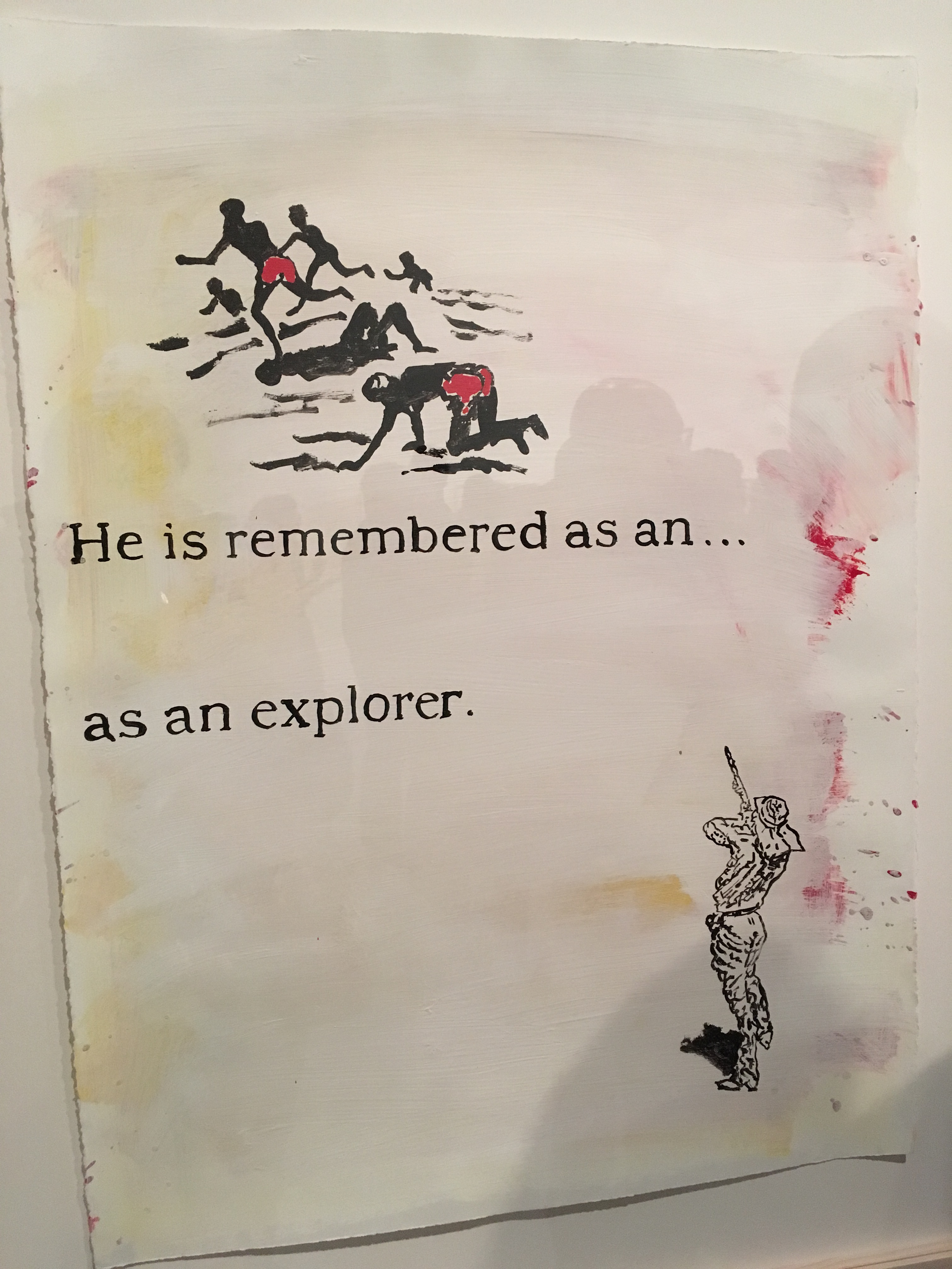 Bennett’s choice of media in this exhibition is varied. Stark sketches and selective uses of colour are used to stage a sharply critical dialogue with historical events. The history of colonialism in Australia is presented in a series of storyboard-esque images, bitterly contrasting the personification and aggrandisation of violent colonial oppressors with the brutalised Indigenous figures. Issues of voice and silence are repeatedly revisited. This is a collection that speaks with numerous voices, but at the same time, is revisited by the overarching, wry reflection: “be polite”. How can you be polite in such weighted conversations?