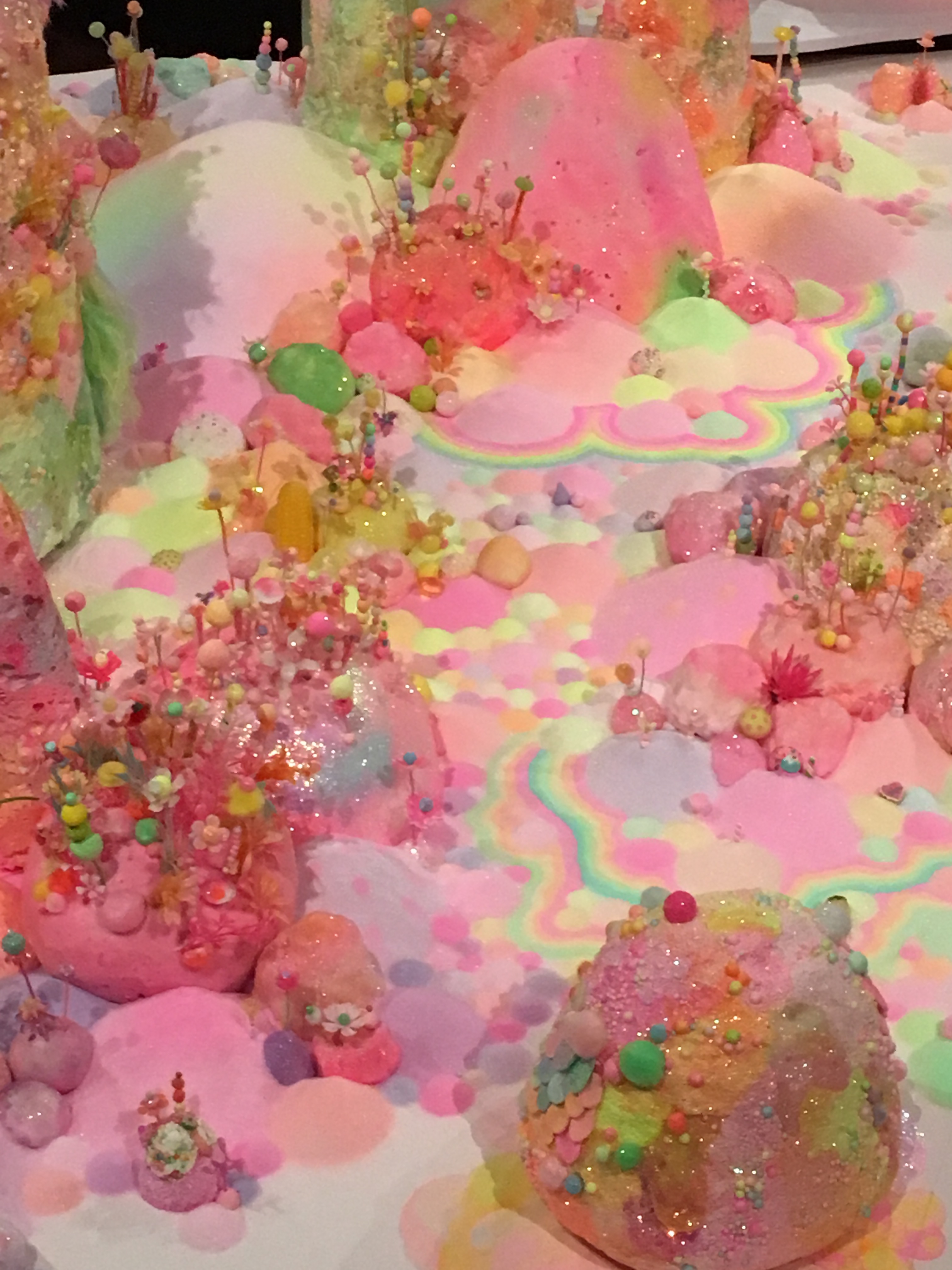 Where to look first? Bright colours, whimsical shapes and an apparent tribute to all things glitter, “When Happiness Ruled” is completely enthralling. In styles reminiscent of decora Harajuku fashion and all thing sweet and pastel, Australian Tanya Schultz, the artist behind Pip & Pop, has created five large installations at PICA gallery in Northbridge. Visitors can patrol the “islands” on the ground level, which works best for identifying the smaller scenes and intricate details, but PICA’s overhanging balcony also offers a view to mirror the smaller paint splatters that decorate the floor. From above, the installation resembles a cluster of brightly coloured petri dishes, teeming with life.