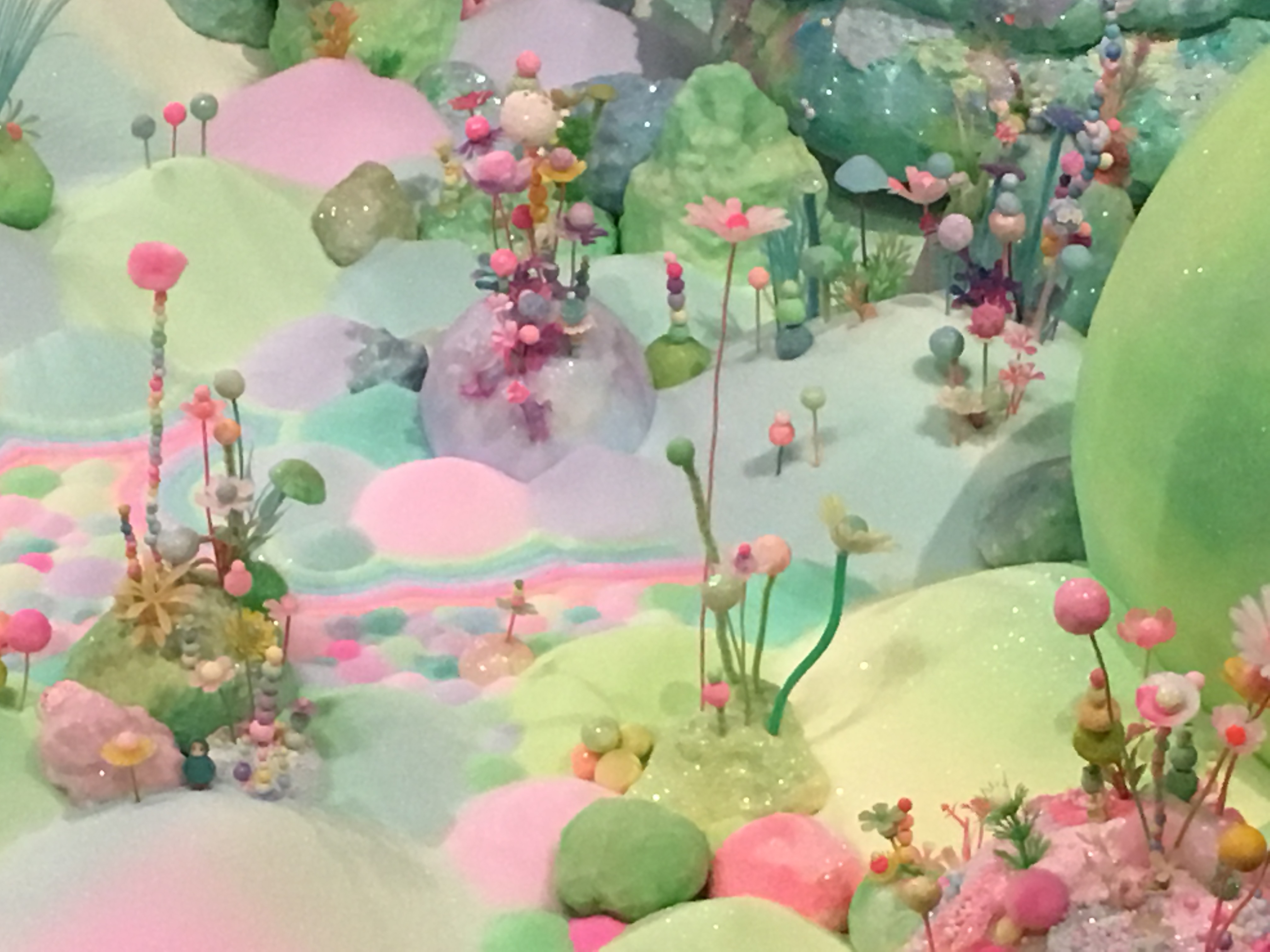 ge. Fantastical “monsters”, made of pastel-daubed tinsel and foam, move in slow circles. Some of the squat foam mountains have plastic eyes, but others appear to have been gouged out, layered under cloudy pastels.There is a sense that a fairytale more in the style of Grimm is being played out in some of the tiny scenes.