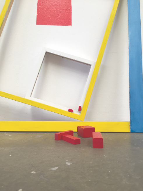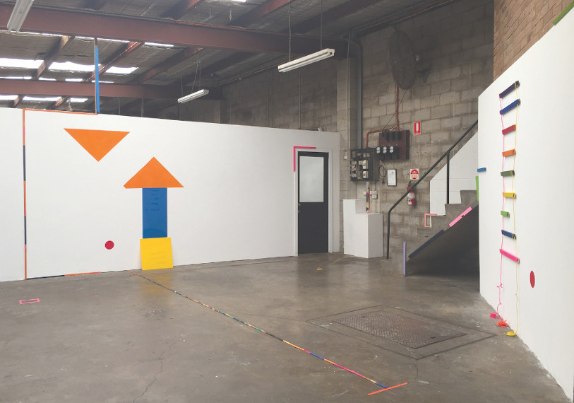 of elemental geometric forms, bright colours, taped lines and placement of other