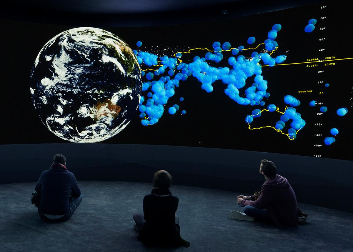 The 45-minute multimedia work breathes life into statistics gathered from over one hundred sources reflecting the increasing pressures which the world faces today, including the unprecedented rise in displaced populations; migrants and refugees who are forced to leave their homes. The audio and visual impact of EXIT creates a sense of urgency with a 3D panoramic view of an orbiting globe moving across the screen in almost full circle, broken only by the entrance and exit. Each time it begins its cycle, the audience is stuck by the visual and auditory representation of data and statistics which fall under the six themes: Population Shifts: Cities, Remittances: Sending Money Home, Political Refugees and Forced Migration, Natural Disasters, Rising Seas and Sinking Cities, and Speechless and Deforestation.