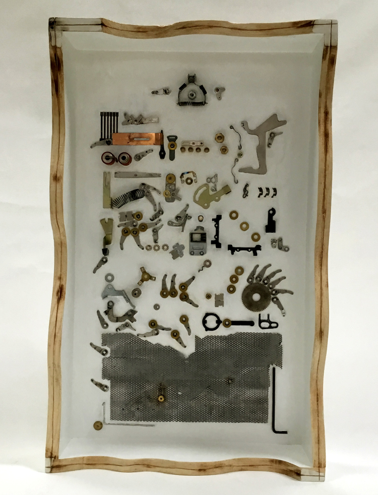 Abstract Machines: Fusion Box Sculptures, collages, deconstructions, re-assemblages – modernism reconsidered. In part an homage to the great Surrealist Box Makers and artists of the 20th Century, to Joseph Cornell and Leonora Carrington, modernist writers Virginia Woolf and Gertrude Stein, the works combine wood, metal, glass, canvas as objects of altered meaning and value. Working with metallica, found objects, deconstructed machines like typewriters, sound players, slide projectors, cameras, and inspired by Gertrude Stein’s 1925 essay ‘Composition As Explanation’, this is Composition As Recombination.