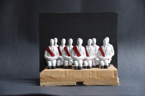 This diorama is one of a set of ten looking at the processes of extracting a saleable product in a similar way to milking: from a live producer, cow, or human. The power structure is revealed initially in the first of the series by a formal portrait setting of the overseers in dress uniform, through the medical support staff who have no feasible defence for their actions, and then a series of small vignettes is populated by figurines representing the producers of blood housed among the clunky industrialisation of farming. The dioramas are charming. Each small figurine asserts their own agency, their own individuality, and yet the producers stand in their own stall, waiting to be milked. In the real world these figurines are mass-produced, each very much like the other, each almost infinitely replaceable.