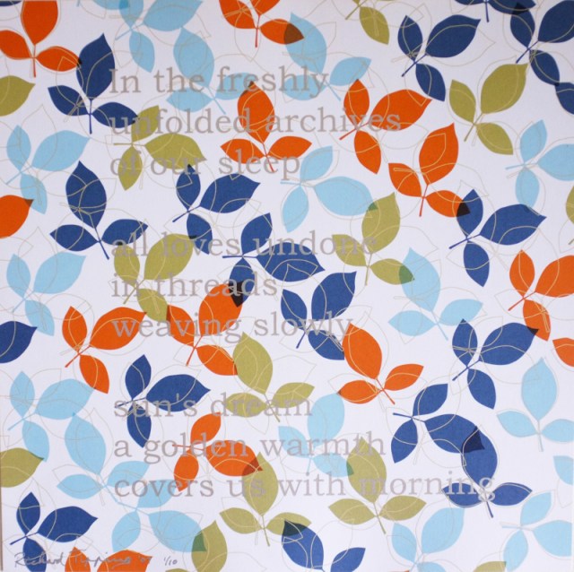 Morning is one of three lyrical spoken poems chosen for the Lovepoems folio of screenprints, made in 2007 along with four visual poems, a total of seven which are put through variations in graphic presentation.