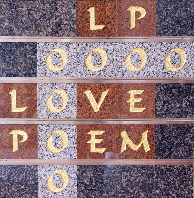 In 2008 Lovepoem was made as a wall work with letters engraved into granite tiles, held in stainless steel rails. This, again, is questioning poetry’s formal demand for uncluttered clarity (black text only, on the white snowfield of the page) against celebrating the interference of overlay and juxtaposition, and colour’s impact.