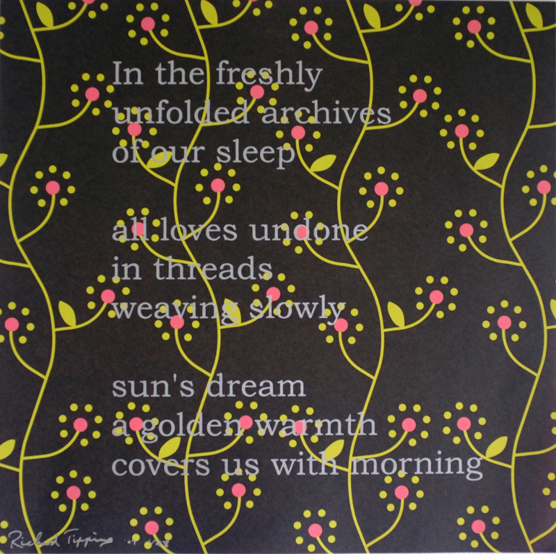 Morning is one of three lyrical spoken poems chosen for the Lovepoems folio of screenprints, made in 2007 along with four visual poems, a total of seven which are put through variations in graphic presentation.