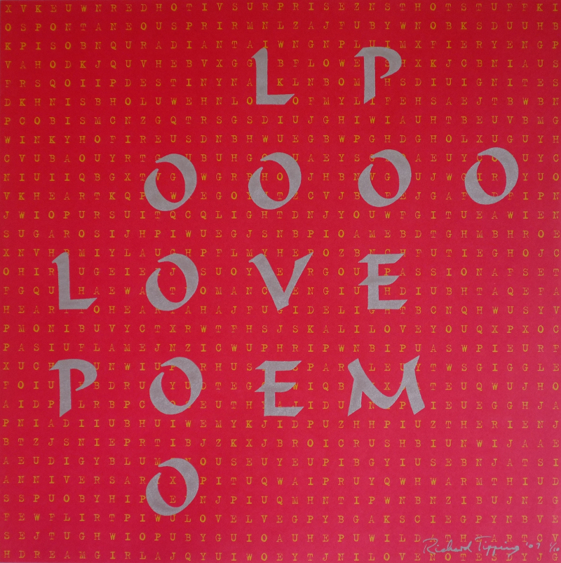 With the Lovepoem suite of twenty different screenprints, there’s exploration of how the visual presentation of a poem effects its reading upon a viewer, who is affected by the difficulty of viewing and reading simultaneously. There is a strong contrast between the printed words of the poem in silver and the busy pattern background. In many of the prints the poem’s speech becomes overwhelmed in the ground pattern. However, viewed at a slight angle the silver ink jumps out, making the text highly visible. Poetry is essentially a spoken art of memorable words, and I’m trying to make these poems sit as a vocal element in a visual domain, ready to be said aloud or silently voiced by the viewer.