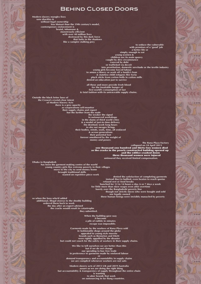 The artwork and poem Behind Closed Doors was prepared for the Modern Art Projects Blue Mountains (MAPBM) exhibition Sewn Up! which has been impacted by Covid-19 restrictions. The exhibition is now a incidental installation at the Lyttleton Stores, Lawson. In the post Covid world it is hoped that the exhibition will be rehung and the intended educational programs will be able to take place.