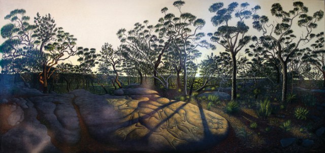 Following a series of recent health issues, including a series of small strokes, this benefit exhibition is being held to raise urgently needed funds to support Glasheen’s rehabilitation at home. Glasheen developed a deep knowledge and respect for Aboriginal traditional culture and its spiritual connection to Country. This exhibition includes his surreal renderings of Australian landscape based on the rock art sites, coastal vistas and caves of the Sydney/Hawkesbury and South Coast regions. True to the tradition of plein-air they have been painstakingly executed in pencil, onsite over many months. These are subsequently used as source materials for further experimentation. They are photographed then printed in various scales and visually dramatised with colour and imposed imagery where they are variously coloured using pastel and paint.