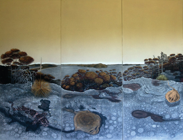 Following a series of recent health issues, including a series of small strokes, this benefit exhibition is being held to raise urgently needed funds to support Glasheen’s rehabilitation at home. Glasheen developed a deep knowledge and respect for Aboriginal traditional culture and its spiritual connection to Country. This exhibition includes his surreal renderings of Australian landscape based on the rock art sites, coastal vistas and caves of the Sydney/Hawkesbury and South Coast regions. True to the tradition of plein-air they have been painstakingly executed in pencil, onsite over many months. These are subsequently used as source materials for further experimentation. They are photographed then printed in various scales and visually dramatised with colour and imposed imagery where they are variously coloured using pastel and paint.