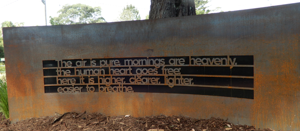 Featured image Jena Woodhouse poetry sculpture (lines from ‘Green Dance’) in Main Street, Tamborine Mountain