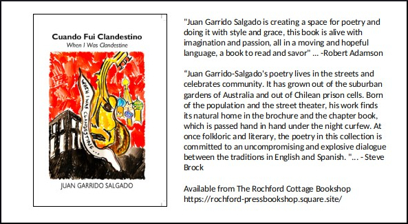 This is a volume of poems that is well travelled, written in the in-between spaces of countries including Chile, Australia, Russia, Spain and Nicaragua. International in outlook, home and away is a central theme, with poems smuggled across borders and living clandestine lives in the margins of the societies they inhabit.
