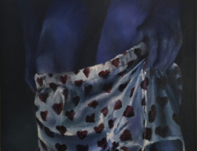 My recent series of paintings in particular emphasises figures wearing heart-patterned boxers, a visual gag inherited from the cartoons I grew up with. This ubiquitous trope’s humour comes from emasculating the subject. To my mind, the boxers are a symbol of a lapse in one’s identity at the mercy of others, existing between various social roles and expectations.