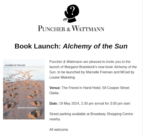 Margaret Bradstock is a Sydney poet, critic and editor. She lectured at UNSW for 25 years and has been Asialink Writer-in-residence at Beiing University, co-editor of Five Bells for Poets Union, and on the Board of Directors for Australian Poetry. She has eight published collections of poetry, including The Pomelo Tree (winner of the Wesley Michel Wright Prize) and Barnacle Rock (winner of the Woollahra Festival Award, 2014). Editor of Antipodes, the first Australian anthology of Aboriginal and white responses to “settlement” (2011) and Caring for Country (2017), Margaret won the Banjo Paterson Poetry Award in 2014, 2015 and 2017. Her most recent book is Brief Garden (Puncher & Wattmann, 2019), with a new collection, Alchemy of the Sun, to be launched on 19th May 2024.