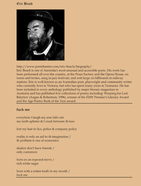 Rochford Street Review was saddened to hear of the death of Eric Beach during the week. We will look to publish a full tribute to Eric in the coming weeks but, as an immediate tribute, we are republishing Eric’s poems, as selected by Rae Desmond Jones, which appeared in The Selected Your Friendly Fascist, Rochford Press, 2012.