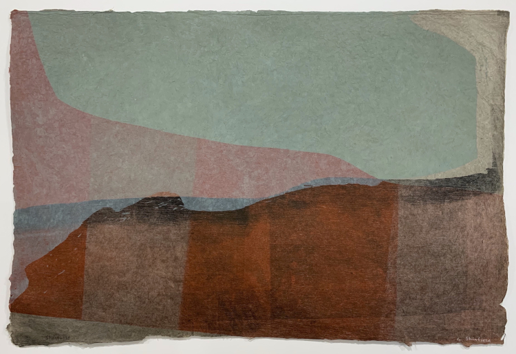 Recent work was begun after spending time at Bunjil’s Shelter near the Grampians in Victoria. This site contains a cave with ancient rock art and is protected from entry by a wire cage. Responding from my own experience of being on site, a number of woodcuts were painted with black ink and carved. Lino blocks covered with wax were scraped and gouged, and later etched in the studio. Blocks were printed in different configurations on various handmade papers as single and multiple images. (A ‘multiple’ is an image made up of many parts.) These works are a reflection on the instability of living in present times, and the need to create one’s own places of shelter.
