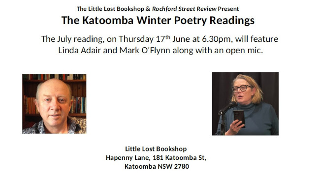 The Little Lost Bookshop & Rochford Street Review Present The Katoomba Winter Poetry Readings. The July reading, on Thursday 17th July at 6.30pm, will feature Linda Adair and Mark O’Flynn along with an open mic.