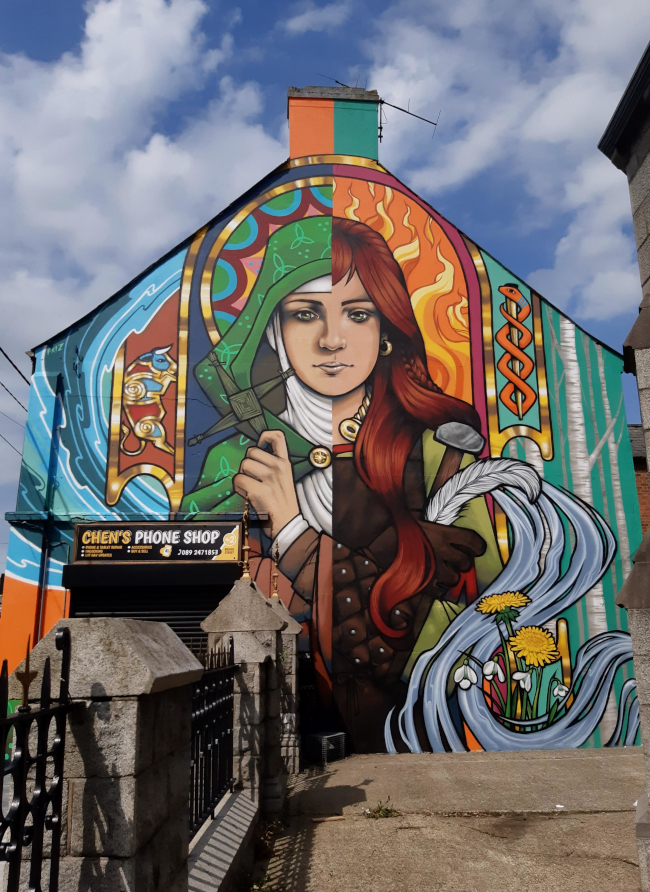 Brigid of Faughart Mural, created in Bridge Street, Dundalk, by Belfast based artist Friz. The mural incorporates many aspects of Brigid as both Christian Saint and Pre-Christian Goddess. You can find Friz athttps://thisisfriz.com/